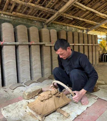 Ông Hoàng Công Hưng trình diễn quy trình làm ngói âm dương với du khách. |